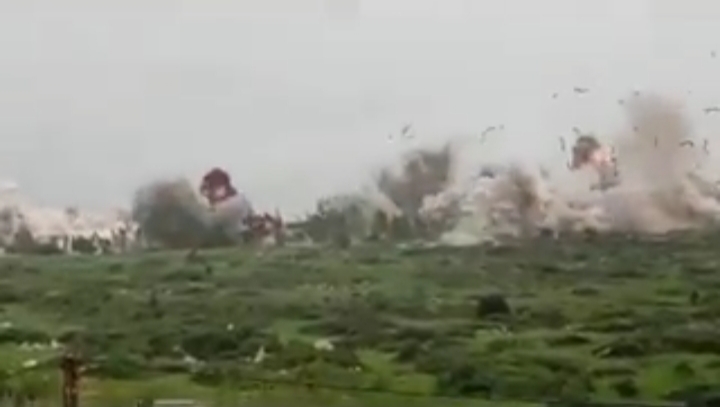 L'armée d'occupation israélienne fait exploser un groupe de maisons - dont les habitants ont été déplacés de force - dans le village de Naqoura, au sud du Liban.