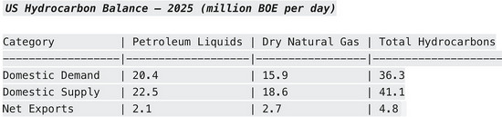 In short, the global hydrocarbon market is highly integrated and with the rise of the LNG sector and growing LNG tanker fleet has become more seamless than ever under the one price rule of markets. In this context, the US production in 2025 of 41.1 million BOEs per day of petro liquids and nat gas was nearly as large as the 51.3 million BOEs per day coming out of the Persian Gulf. ((Saudi Arabia, Iraq, UAE, Iran, Kuwait, Qatar, and Oman).