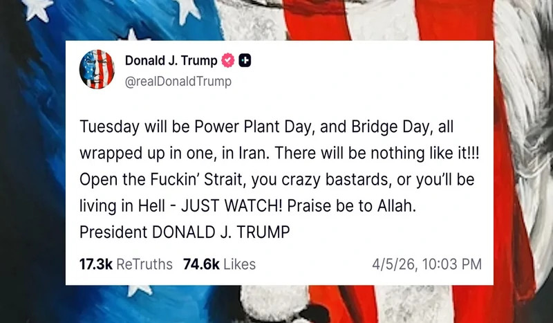Le président des États-Unis a publié un  message complètement dingue sur Truth Social, menaçant une fois de plus de faire sauter des infrastructures civiles en Iran : "Mardi sera le jour de la destruction des centrales électriques et des ponts, tout en un, en Iran. Ce sera du jamais vu ! Ouvrez ce putain de détroit, bande de cinglés, ou vous irez en enfer ! Vous verrez ! Louange à Allah. Président DONALD J. TRUMP."