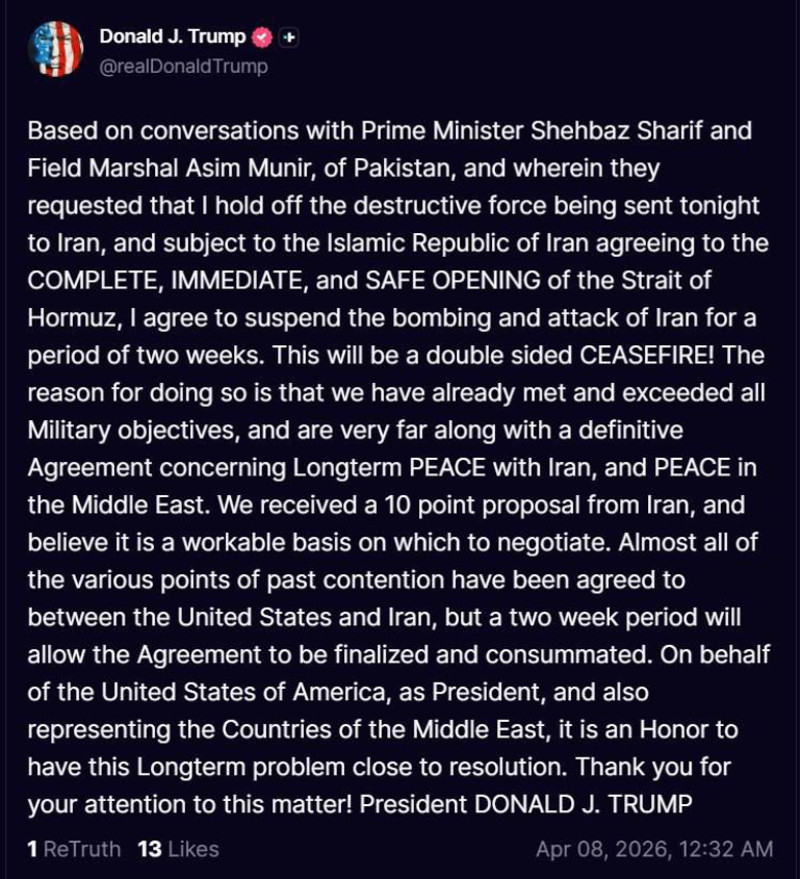 Remarque : ce message a été publié par le plus haut responsable diplomatique d'un pays — le président des États-Unis — à la veille des négociations de cessez-le-feu avec un pays que les États-Unis ont attaqué sans aucun fondement juridique. À mon sens, cela met un terme au chapitre du "cessez-le-feu".