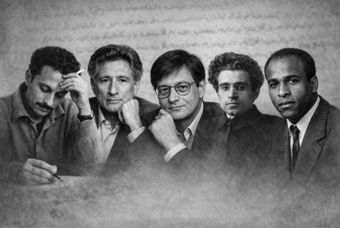 De gauche à droite : Ghassan Kanafani, Edward Saïd, Mahmoud Darwich, Antonio Gramsci, Frantz Fanon.