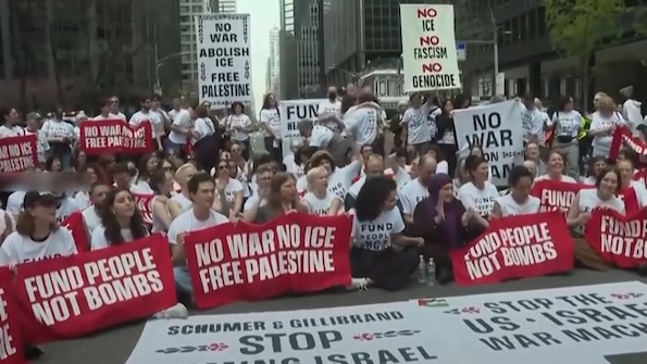 La police de New York a interpellé environ 100 manifestants lundi, après un sit-in de plus de 300 opposants à la guerre devant les bureaux de Manhattan de Chuck Schumer et Kirsten Gillibrand. Les manifestants faisaient pression sur les sénateurs pour qu'ils appuient un vote attendu au Sénat sur la suspension des futures ventes d'armes américaines à Israël.
