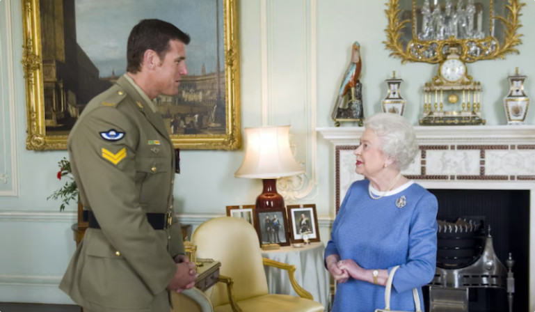 La reine Elizabeth II salue le caporal Ben Roberts-Smith au palais de Buckingham le 15 novembre 2011, peu après la remise de la Croix de Victoria. (Crédit photo: Anthony Devlin/AP)