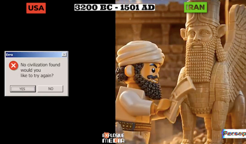 Parmi les dernières créations remarquables de cette guerre culturelle figure l'animation " Age de pierre", réponse à la menace d'anéantissement de la civilisation perse proférée par Trump... Postée par l'ambassade d'Iran en Malaisie, elle est accompagnée du commentaire suivant : "Les empires s'effondrent alors que la vraie civilisation perdure"