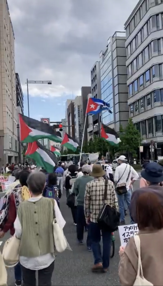 Des militants défilent à Kyoto, au Japon, en signe de solidarité avec les peuples palestinien, libanais et iranien face aux récentes attaques israéliennes.