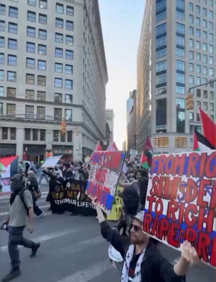 À l'occasion de la Journée des prisonniers palestiniens, des manifestants envahissent les rues de New York pour réclamer la libération de tous les détenus des prisons israéliennes et exprimer leur soutien à Gaza.