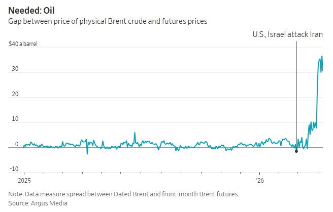 A few days later, an article in the Wall Street Journal told the same story of the strange, massive gap that had suddenly appeared between "fictional" and physical oil prices: