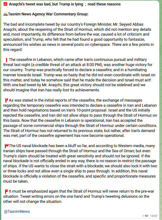 Later that same day, Iran's Tansim state news agency released several items and a long statement explaining that the original Tweet declaring the strait reopened had been incomplete and mistaken, and totally misinterpreted by Trump: