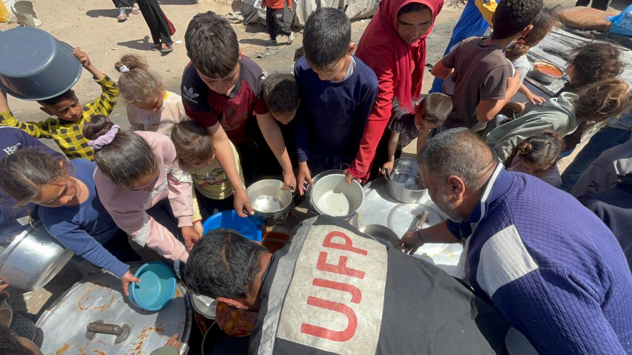 Au cœur de ce contexte difficile, le rôle des organisations humanitaires constituent l'une des principales lignes de vie empêchant un effondrement total. Ces programmes ne sont plus de simples réponses d'urgence : ils font désormais partie intégrante de l'équation de survie quotidienne, notamment dans des zones comme Khan Younès et Deir al-Balah, qui accueillent un grand nombre de déplacés et nécessitent une intervention continue et structurée. À Khan Younès, notamment dans les camps d'Al-Fajr et d'Al-Soumoud, la cuisine humanitaire de l'UJFP prépare et distribue chaque jour des centaines de repas aux familles déplacées, en particulier aux agriculteurs de l'est de Khan Younès qui ont perdu leurs moyens de subsistance. À Deir al-Balah, la scène se répète sous une autre forme mais c'est la même : des centaines de familles font la queue devant un autre centre, attendant leur tour pour subsister.