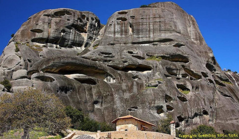 Et c'est à cette occasion qu'en Thessalie de l'ouest sous les Météores aux célèbres monastères, qu'une étonnante marque polychrome apparaît chaque année dans une cavité de la paroi nord de la grande colonne rocheuse d'Agio Pneuma. Il s'agit de l'ancien minuscule monastère dit de Saint-Georges-des-Mouchoirs fondé au XIVe siècle.