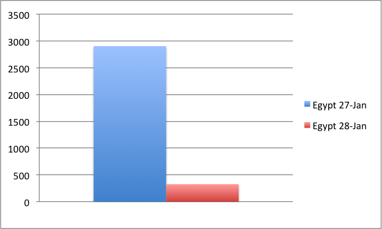 Le site BGP Mon a publié un état des lieux du réseau Internet en Égypte. Il est pour le moins critique et risque de s'aggraver dans les heures qui viennent. Hier, jeudi 27 janvier, le nombre de routes permettant d'acheminer des données à destination s'élevait à 2 903. Aujourd'hui, il n'en reste plus que 327. Autrement dit, 88 % du réseau Internet en Égypte est inaccessible.