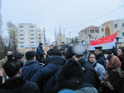 C'est alors que des renforts sont arrivés, dont trois jeeps de la sécurité préventive de l'Autorité palestinienne qui roulaient à toute vitesse à côté des gens, visiblement pour les intimider. Tous les membres de la sécurité étaient armés, et ils disaient entre eux de ne pas parler aux femmes et de pousser les hommes. Nous avons été repoussés à 300m de l'ambassade.