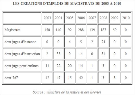 En revanche, impossible de retrouver les 8 510 annoncés. Sur la même ligne qu'en 2003, ne figurent, en effet, en 2009, que 7 893 magistrats. Et on peut ajouter que le mouvement ne va pas à la hausse, puisque la loi de finances pour 2011 prévoit la disparition de 76 postes de magistrats.