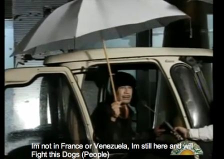 Quand Khadafi est apparu, soi-disant en «direct» de sa résidence de Bab Al Azizia à Tripoli, à la télévision d'Etat, dans une voiture et sous un parapluie - ce qui ne laisse pas préjuger qu'il dispose de toutes ses facultés mentales, il a déclaré: