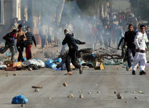 La police a tiré en l'air pour disperser, sans succès, l'immense foule qui criait « Va-t-en ! » - le même slogan scandé lors des manifestations précédentes contre Ben Ali et dans le mouvement égyptien contre Moubarak - et « Nous ne voulons pas des amis de Ben Ali ! ».