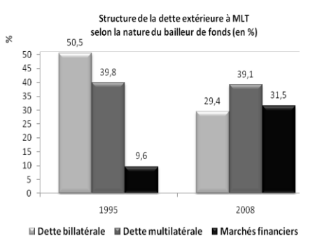 Ensuite, l'évolution de la structure de l'encours de la dette externe selon la nature du bailleur de fonds, depuis 1995 |6|, montre un net raffermissement de la part des bailleurs privés. En effet, la part relative revenant aux marchés internationaux de capitaux a progressé de 9,6% en 1995 à 31,5% en 2008. Dans le même temps, le stock revenant à des sources publiques a reculé de 90,4% à 68,5%. A cela s'ajoute la progression assez nette des emprunts à court terme dont la part est passée de 10%, de l'encours de la dette extérieure totale, en 1995 à 21% en 2008. Cette évolution confirme la détérioration tendancielle des termes de l'endettement extérieur de la Tunisie.