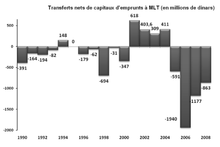 Le paiement du service de la dette coûte de plus en plus cher, malgré une note de frais déjà assez lourde. Pour assurer la pérennité du paiement, l'Etat n'a d'autres choix que de s'endetter davantage, comme le prouve l'augmentation du rythme moyen annuel, des emprunts et crédits nouveaux, de 1,4 MD, durant les années 90', à 2,7 MD au cours des années 2000. Cependant, malgré cette hausse sensible du rythme de l'endettement nouveau, l'on reste en dessous du compte, comme l'atteste le creusement du déficit des transferts nets de capitaux à MLT qui a atteint plus de 4,5 MD, de 2005 à 2008.