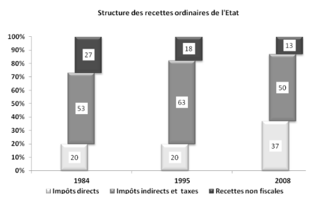 Entre 1995 et 2008, alors que le PIB nominal a été multiplié que par 3, les recettes fiscales, au titre de l'impôt direct, ont été multipliées par 5,7 : leur valeur est ainsi passée de 0,8 à 4,5 MD. Cela nous éclaire sur ce processus d'effritement du pouvoir d'achat des salaires, dont la mesure où ils contribuent largement dans les recettes fiscales. En effet, l'impôt moyen sur les salaires a progressé de 8,2% en 1995, à 10,1% en 2000 et à 11,1% en 2004 |19|.