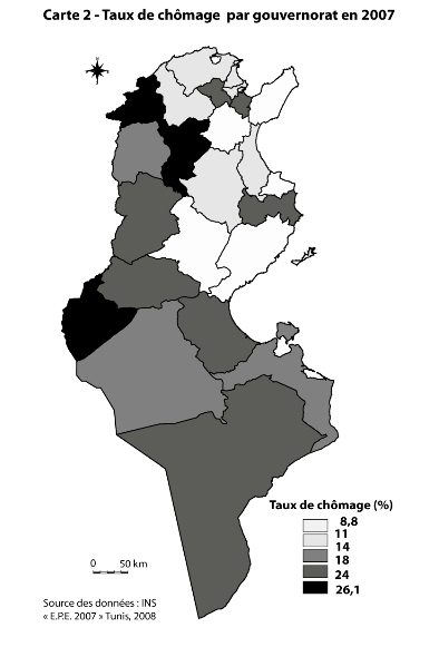 - les régions de l'intérieur du pays. En effet, L'emploi est très inégalement réparti sur l'ensemble du territoire. Les deux régions littorales Nord est et Centre est concentrent à eux deux plus de 80% des 122 zones industrielles que compte le pays et la même proportion en ce qui concerne les emplois. Six gouvernorats sont particulièrement accablés par le chômage : Gafsa (20,1%), Gabès (21,1%), Kasserine (22,5%), Siliana (24%), Jendouba (24.1%), et Tozeur (26,1%).