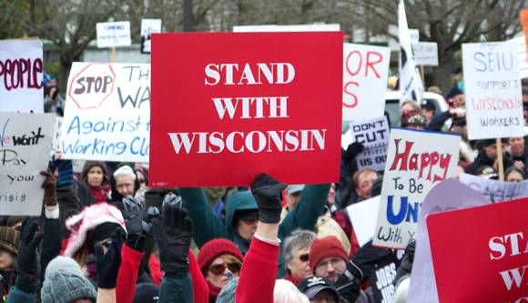 Scott Walker, gouverneur Républicain fraîchement élu entend frapper un grand coup : sous prétexte de réduire le déficit et relancer l'économie sans augmenter les impôts, il veux offrir des réductions des taxes pour les entreprises et faire payer la note aux travailleurs du secteur public. Sa ‘recette miracle' : retirer aux syndicats quasiment toute possibilité de négocier collectivement. Une telle loi auraient des conséquences dramatiques pour les travailleurs, mais aussi pour les syndicats qui seraient amputés de leur moyens d'actions et condamnés au déclin. Un déclin qui se répercuterait sur le Parti Démocrate qui bénéficie du soutien financier et de l'influence des syndicats. Walker veut aussi réduire la contribution de l'État au Medicaid, le programme d'assistance médicale aux plus démunis et aux personnes souffrants d'handicaps.