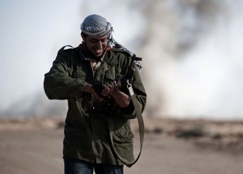 Insurgé libyen rechargeant son arme lors des combats aux abords de la ville de Ras Lanuf