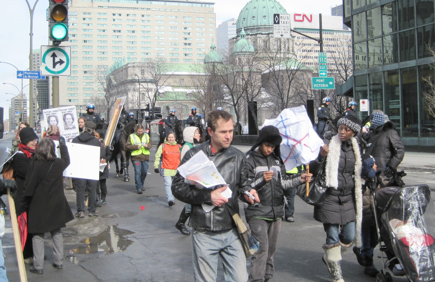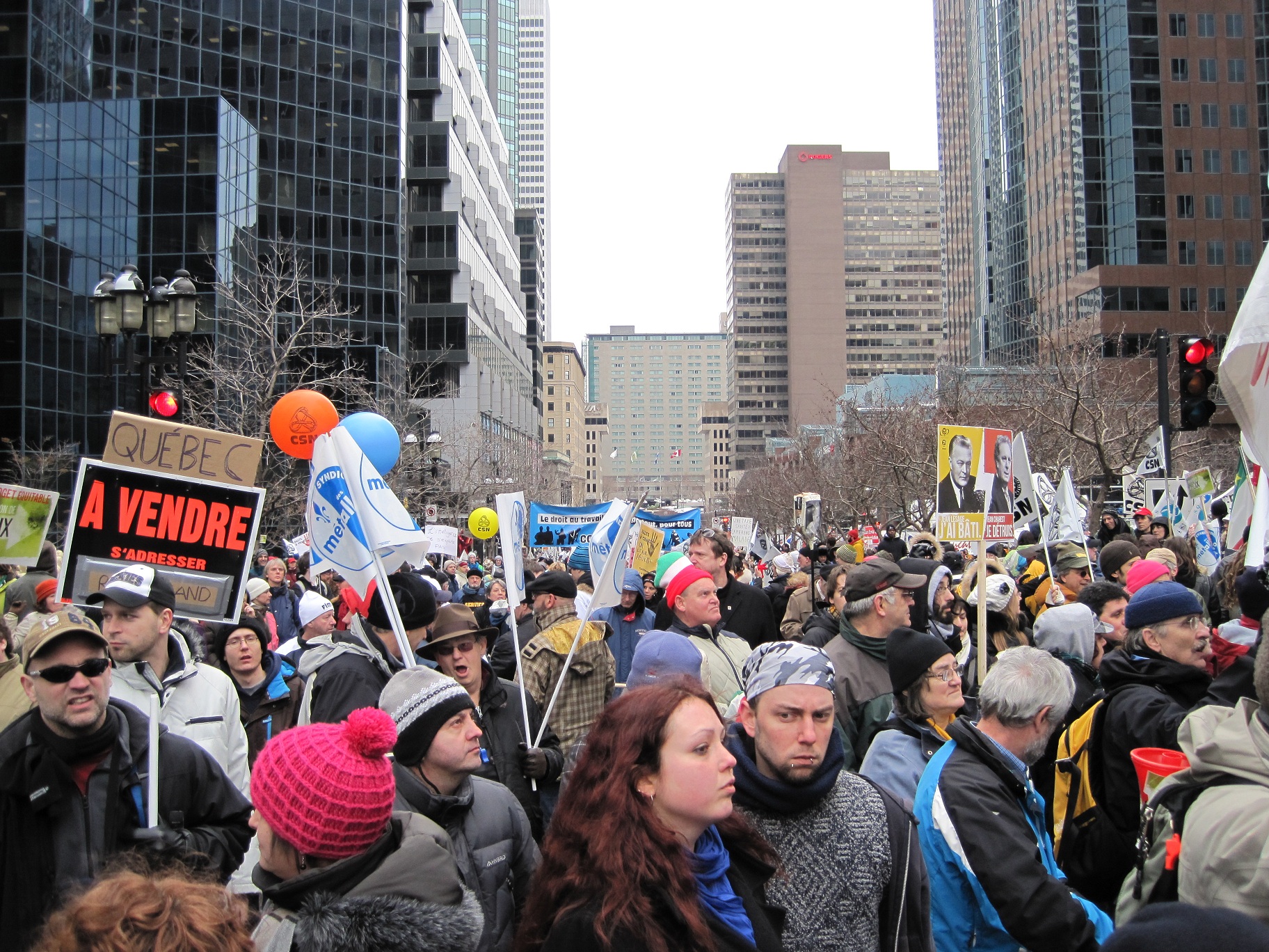 Des délégations de travailleurs de la santé, d'enseignants, de fonctionnaires, et de syndicats industriels tels les métallos, accompagnées de nombreux contingents d'étudiants, ont défilé de la Place du Canada jusqu'au bureau du premier ministre Charest sur l'avenue McGill College pour exprimer leur vive colère face aux mesures anti-sociales du gouvernement Charest.