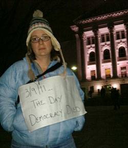 En fait, l'adoption du projet de loi révèle les conséquences de l'assujettissement de la lutte de masse des travailleurs et des jeunes de Wisconsin au Parti démocrate et aux syndicats. Depuis le début, la fuite des sénateurs démocrates dans l'Illinois avait pour but d'arracher l'initiative des mains des employés du public, des étudiants et des enseignants qui avaient les jours précédents lancé une vague de grève « d'arrêt de maladie » (« sick-in ») contre le projet de loi en impliquant des dizaines de milliers d'entre eux.