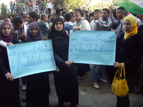 En Cisjordanie comme à Gaza, cette journée de mardi 15 mars est marquée par des manifestations dans toute la Palestine pour réclamer l'unité nationale contre l'occupant israélien. Ziad Medoukh, enseignant à Gaza, nous fait parvenir quelques photos des milliers de manifestants qui réclament pacifiquement la fin de la division : femmes, hommes, enfants et surtout des jeunes qui ont lancé un appel à l'unité nationale autour du drapeau palestinien et avec un un seul mot d'ordre : le peuple veut la fin de la division.