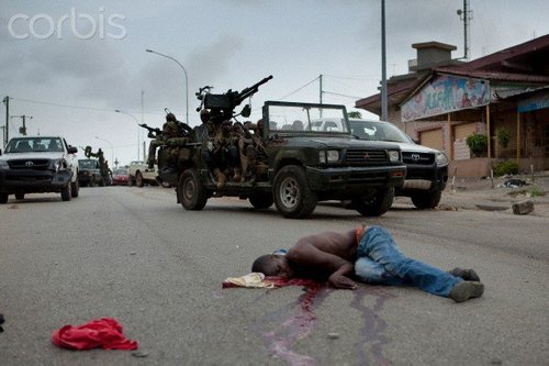 Dans la première photo ci-dessus, des civils sont utilisés comme bouclier humain par les rebelles de Ouattara. Dans la seconde, l'un des civils servant de bouclier est tué lors d'un échange de tirs.