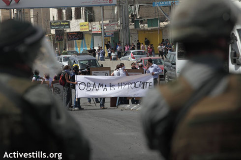Un groupe d'activistes ont manifesté au checkpoint de Qalandia contre la répression sanglante du jour de la Nakba de la semaine dernière (15 morts, des centaines de blessés, y compris par obus tirés depuis des chars à Gaza) et le dernier discours de Barack Obama, qui continue aveuglément à soutenir Israël à tout prix et a omis de faire le lien entre les révoltes arabes et le droit légitime des Palestiniens de protester contre l'occupation.