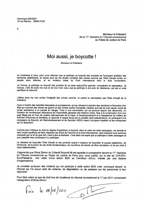 Je vous soutiens de tout coeur. je trouve inadmissible que soient ainsi poursuivis ceux qui boycottent Israël.... Moi-même, je refuse d'acheter des produits israéliens, qui viennent peut-être des territoires occupés, et je le dis haut et fort.