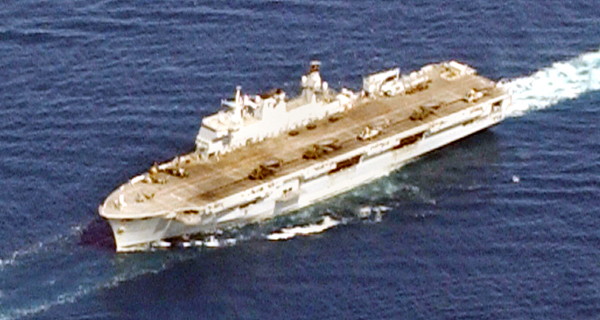 Le navire britannique HMS Ocean, déployé à partir de Chypre, est équipé comme porte-hélicoptères, pour des hélicoptères Apache.