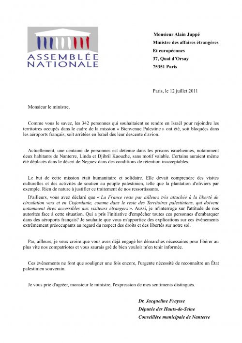 Mission Bienvenue en Palestine : Question de la députée Jacqueline Fraysse