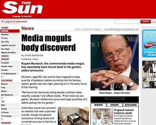 Comme à son habitude, LulzSec n'a pas fait dans la dentelle. le collectif [s'est attaqué] au site web du Sun, un autre tabloïd possédé par News Corporation, pour annoncer la (fausse) mort de Rupert Murdoch. Tout un article a été publié hier soir en Une du site web, indiquant que le magnat des médias australo-américain a été retrouvé sans vie dans son jardin, suite à une ingestion excessive de palladium.