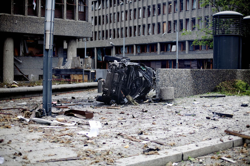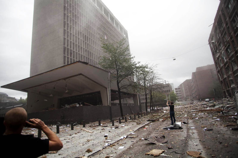 Ce dernier, qui devait assister à la réunion visée sur l'île d'Utoya mais n'y était pas, a vu ses bureaux dévastés, éventrés de part en part par une ou deux puissantes explosions, selon les témoignages. Il n'était pas présent sur les lieux non plus au moment de l'attentat. Le quartier, qui abrite le siège du gouvernement, plusieurs ministères et la rédaction du tabloïd Verdens Gang, était jonchée de débris de verre et des gravats de bâtiments soufflés par l'explosion. Le quartier, qui semble avoir subi un bombardement, a été totalement bouclé par la police tandis que les secours ont emmené des dizaines de passants, plus ou moins gravement blessés et en sang, vers les grands hôpitaux d'Oslo. Au moins un véhicule bourré de nitrate d'ammoniaque, un engrais chimique courant et facile à se procurer, serait à l'origine de cette dévastation.