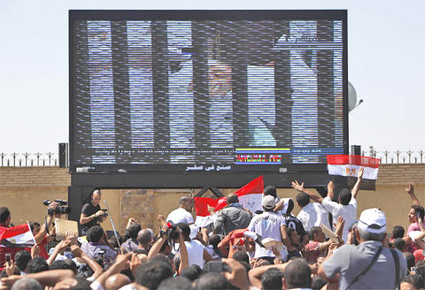 Hosni Moubarak est visible sur un écran géant à l'extérieur de l'Académie de la police militaire du Caire, alors que l'ancien dictateur égyptien entre dans la salle d'audience sur un lit d'hôpital.
