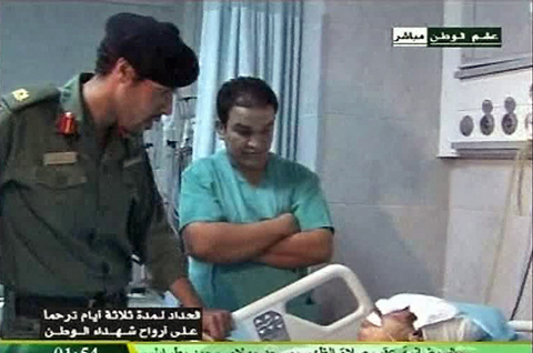 La télévision d'Etat libyenne a montré des images de Khamis, un des fils de Mouammar Kadhafi, rendant visite à des personnes blessées dans une attaque aérienne à l'est de Tripoli.