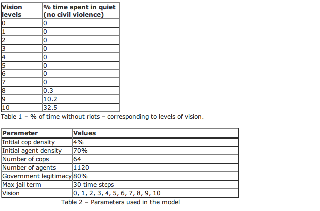 Ce que nous avons fait ici c'est de modifier les conséquences de la variable « vision ». Dans le modèle original [5], les agents et les officiers de police se déplacent de manière aléatoire dans des lieux situés dans leur champs de vision. Nous avons introduit une nouvelle règle selon laquelle les agents se déplacent dans leur champs de vision dans des endroits entourés d'un maximum de protestataires. Le résultat de la simulation modifiée (si vous souhaitez télécharger le code, il vous suffit de cliquer ici) est en accord avec l'utilisation tactique des technologies mobiles par les protestataires, afin d'avoir un avantage cognitif sur les forces de police et pour mieux connaître le terrain, ses ressources et ses éventuels points faibles.