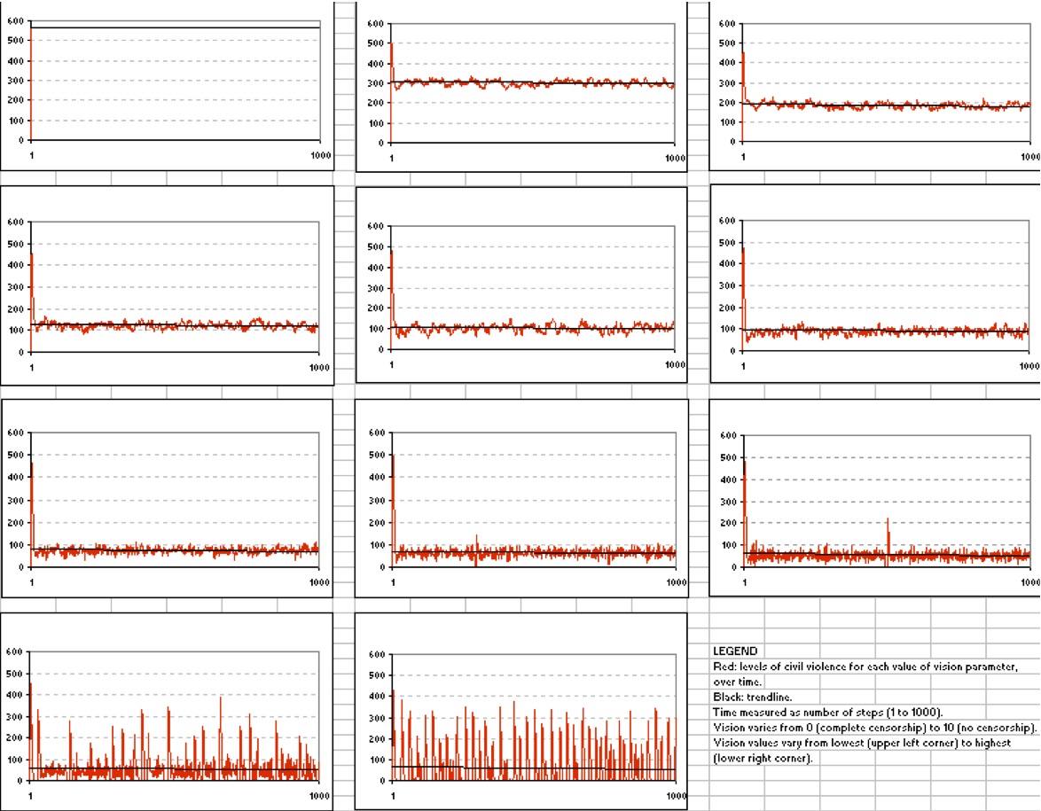 Notre logiciel de simulation reproduit le fonctionnement d'un certain système social (disons par exemple une ville comme Londres) sur une durée considérable (dans notre cas 1000 étapes-temps, « time steps »), avec les différentes valeurs du paramètre « vision », ceteris paribus (c'est-à-dire, toutes choses égales par ailleurs - cf. Table 2 de l'annexe 1 à la fin de ce post). En testant le modèle à plusieurs reprises et en générant des scénarios alternatifs, nous observons les valeurs plus ou moins hautes de la variable « vision » - indiquant les effets d'un changement du niveau de censure.