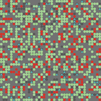 L'attitude de l'agent est influencée par plusieurs variables. La première est le niveau de mécontentement politique propre à l'agent (la «doléance », indiquée en vert plus ou moins sombre sur la figure 1). Cela peut conduire cette personne à abandonner son calme habituel pour devenir un protestataire actif (les cercles rouges sur la figure 1). Mais la décision de passer à l'action - que ce soit pour se lancer dans des pillages sauvages ou pour brûler le Parlement et renverser le gouvernement - est conditionnée par l'environnement social de l'agent (« voisinage »). L'agent peut-il détecter la présence de la police dans les environs (les triangles bleus dans la figure 1) ? Si la réponse à cette question est non, il rentrera en action. Si la réponse est oui, une autre question est soulevée : la présence policière est-elle contrebalancée par un nombre suffisant de citoyens protestant activement ? Si la réponse à cette question est oui, alors l'agent entre en action. Parfois, de manière complètement aléatoire, un citoyen est arrêté par la police et envoyé en prison pour une période de temps donnée (les cercles noirs dans la figure 1). (Encore une fois, si vous vous émerveillez devant la simplicité de cette règle, gardez à l'esprit combien il est compliqué pour la police anglaise de discerner qui fait quoi dans une émeute - et combien des arrestations de ces derniers paraîtront finalement arbitraires.)