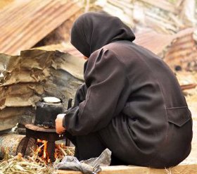 Cela a pris une demi-heure à Keefa pour revenir avec de l'aide ; ils ont allongé Um Ahmed dans une charrette tirée par un âne et sont allés à la grand route pour trouver un taxi et l'emmener à l'hôpital. Quand j'ai rencontré Um Ahmed, elle était couchée sur un matelas par terre et se remettait de sa blessure par balle. Elle avait un foulard bleu pâle sur la tête et des bracelets aux bras. Sa fille était assise à côté d'elle. La pièce était modeste, quelques matelas par terre, deux chaises pour les invités, un buffet et un petit meuble pour la télé.
