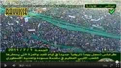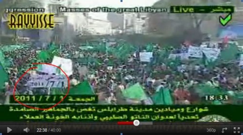 Le soir du 1er juillet est diffusé sur youtube une copie d'un reportage de 40 minutes de la télévision libyenne sur la manifestation. Bien-sûr, no-fly zone oblige, on manque des vues habituelles prises d'hélicoptère. Néanmoins ces images laissent peu de doute sur l'ampleur, la localisation et la date de l'évènement. La date par exemple est confirmée par cette séquence vers 22:38 - qui ne parait franchement pas avoir été manipulée - où l'on peut voir évoluer une pancarte affichant 2011/7/1. [9]