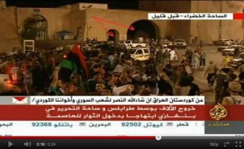Les seules images disponibles sont celles de la télévision libyenne. Elle paraissent un peu plus crédibles que les images de la place Verte « à Tripoli » diffusées 8 semaines plus tard par Al Jazeera le 21/8/11 mais enregistrées selon toute vraisemblance... en studio au Qatar. [12]
