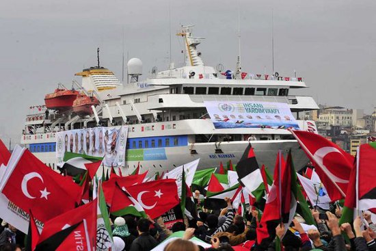 La Mavi Marmara lors de son retour à Istanbul, arborant les portraits des neuf militants turcs assassinés par l'état sioniste - Photo : Reuters