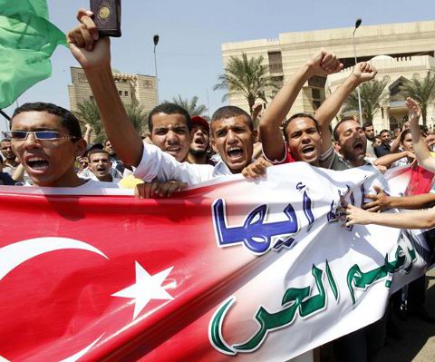 Hisham n'a pas été le seul à être impressionné. M. Erdogan a soulevé une euphorie générale parmi les milliers de personnes rassemblées à l'entrée de l'aéroport international du Caire pour accueillir l'homme dont le pays est pourtant un membre à part entière de l'OTAN. Mais la foule était là pour l'accueillir comme un héros de la cause palestinienne, louant la position d'Ankara contre Israël depuis que les forces navales israéliennes ont piraté au printemps 2010 un bateau d'aide humanitaire qui essayait d'atteindre la bande de Gaza.