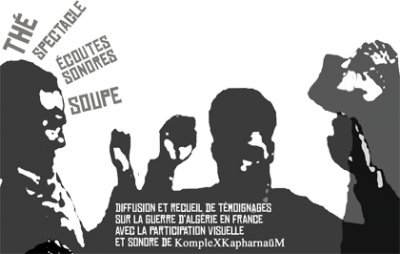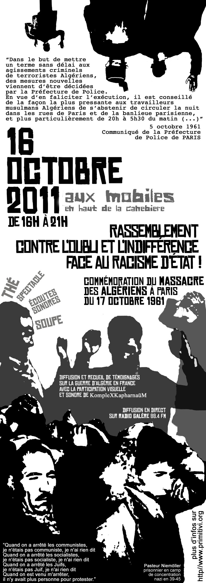 Le Dimanche 16, de 16h à 21h, Un rassemblement aura lieu pour commémorer le cinquantenaire du 17 octobre 1961. Un monument provisoire sera dressé. Ce sera aussi l'occasion de témoigner, ou d'écouter les témoignages des autres : ceux qui se souviennent de ces années là à Marseille, ceux nés plus tard qui savent les traces qu'elles ont laissé. A la nuit tombante (vers 19.30), la compagnie de théâtre de rue KompleXKapharnaüM proposera une intervention spectaculaire multimédia.