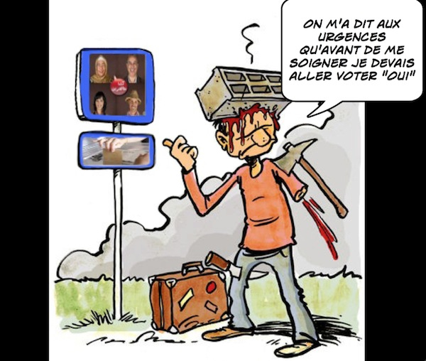 L'instrumentalisation de la religion au profit du oui est une manière civilisée d'éviter les affres de la géhenne aux égarés du mouvement du 20 février. A la fin de la journée de vote, le bourrage des urnes par les agents du Makhzen est notre faon à nous de nettoyer la place et éviter au blanc de se mélanger avec le bleu. Le blanc est une couleur sacrée qu'il faut respecter, c'est la couleur du paradis où seront logés, par la grâce de Dieu, tous les béni-oui-oui. Le bleu, lui, plus proche du noir, est la couleur du vice, de Satan, il peut donc aller à la poubelle!