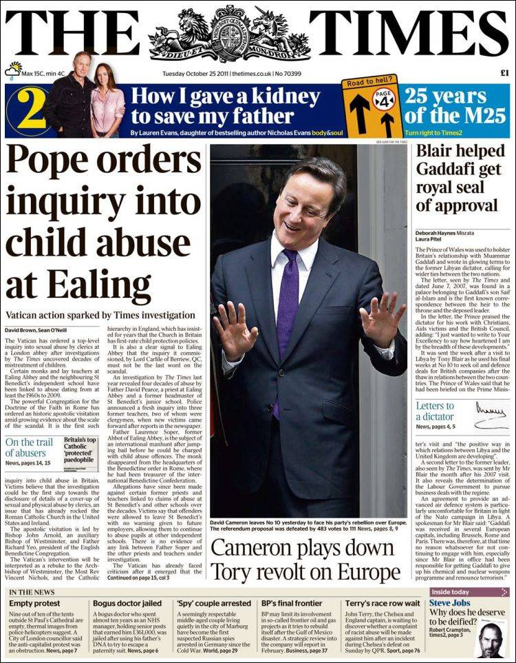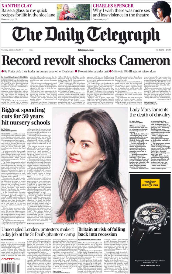 (...) est une chimère protéiforme qui resurgit régulièrement pour mettre à bas les gouvernements. La véritable Union européenne est une bureaucratie qui manque singulièrement de transparence et n'évolue que de façon erratique. Pourtant, malgré tous ses défauts, l'Europe a de la valeur et mérite que l'on en fasse partie, aujourd'hui plus encore que lors de l'adhésion de la Grande-Bretagne au début des années 1970. (...) [Néanmoins], il est probable que toute évolution importante de l'Europe à l'avenir devra être soumise à un référendum en Grande-Bretagne. Or dans le climat actuel, ce référendum serait un échec, ce qui signifie qu'aucun gouvernement britannique n'est probablement en position de soutenir la moindre mesure visant à approfondir l'intégration. Le Daily Telegraph, lui, a vu cette semaine deux "David Cameron en action". En Europe, le premier "était en première ligne, tenant tête au Français Nicolas Sarkozy qui a dit 'en avoir assez' de voir la zone euro recevoir des leçons d'un pays qui a eu la bonne idée de ne pas y adhérer". Mais le quotidien proche des tories s'en prend aussi à