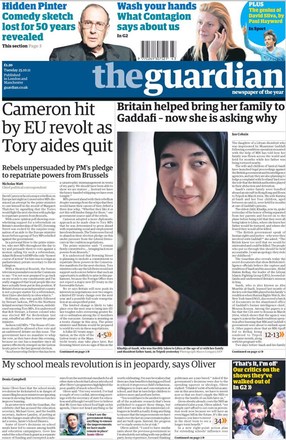 "David Cameron ébranlé par une rébellion massive et une nouvelle fracture européenne chez les Tories", titre The Guardian, alors que 81 parlementaires conservateurs – un record – viennent de voter en faveur d'un référendum sur les relations du Royaume-Uni avec l'Europe, en dépit des instructions de leur parti. Victimes d'une lourde défaite, à 483 voix contre et 111 pour, ces conservateurs rebelles soulignent aujourd'hui que le Premier ministre a obtenu "une large victoire grâce aux instructions de vote imposées par Ed Miliband, le chef des travaillistes, à ses propres parlementaires". Selon le quotidien de centre gauche, David Cameron doit s'attendre à "quatre années de guerre de tranchées contre des députés de base mécontents." A en croire l'éditorial du Guardian,