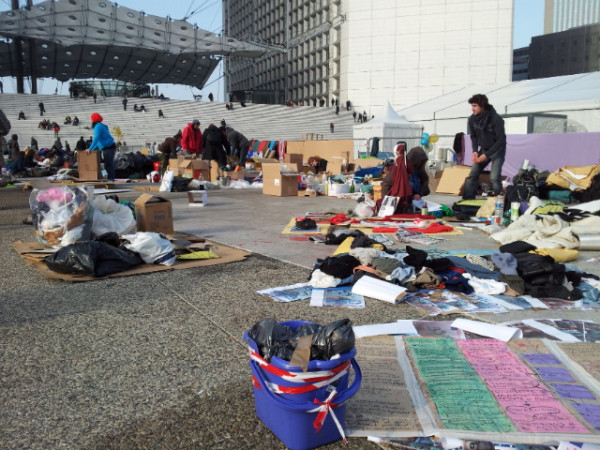 Depuis le 04 novembre, le quartier de la Défense a vu s'installer un campement, symbole de la réappropriation et de l'occupation de l'espace public par de nombreux citoyens Indignés. Une centaine de personnes se relaient afin de faire vivre ce campement depuis 12 jours, avec pour objectif de construire une démocratie plus juste et plus directe.